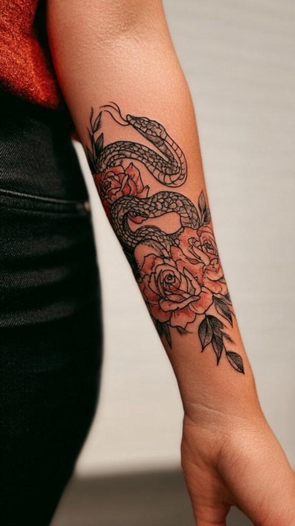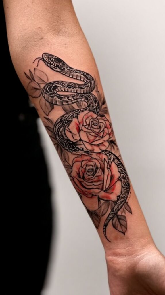 The snake and roses tattoo is a striking design that combines contrasting yet complementary symbols, offering rich layers of meaning. The snake represents transformation, rebirth, and wisdom, symbolizing the ability to shed past limitations and emerge stronger, much like a snake shedding its skin.