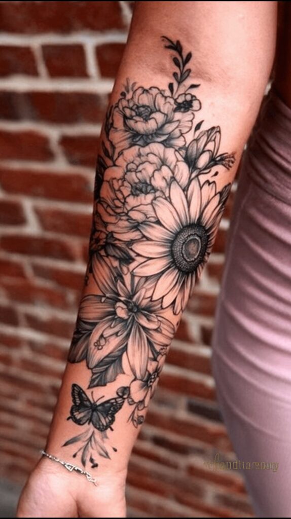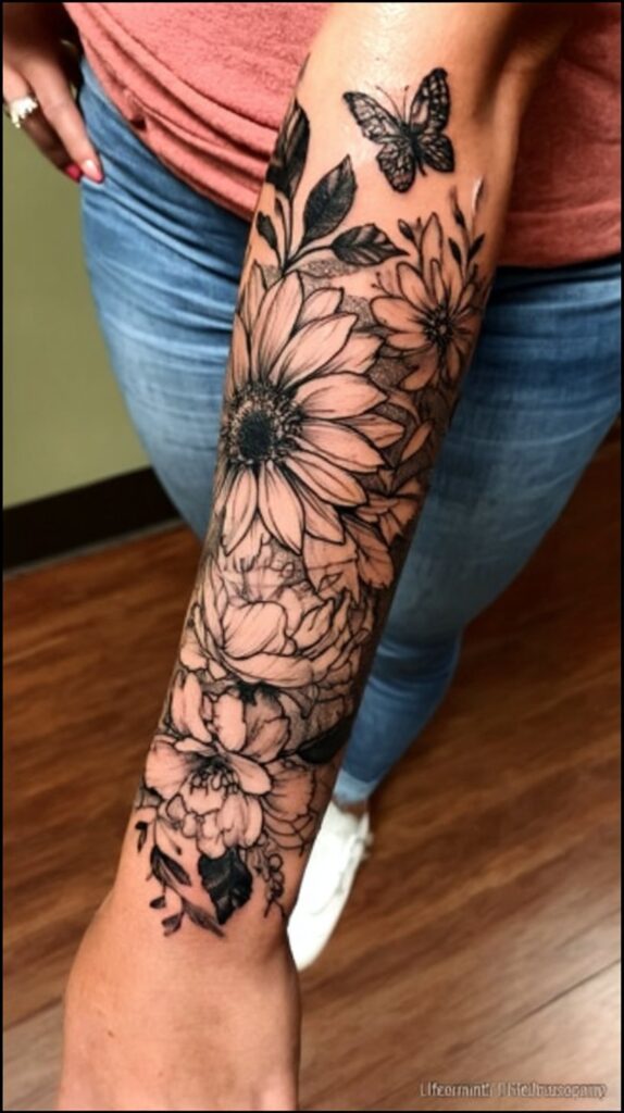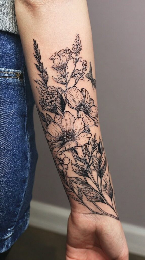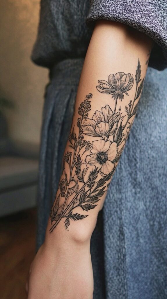 Symbolizing strength, healing, and grace, the wildflower sleeve is a beautiful and meaningful expression for women seeking both femininity and resilience in their tattoo art.