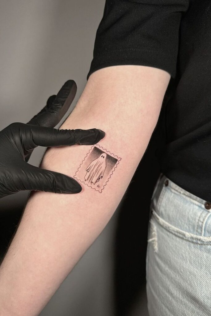 This one-of-a-kind ghost mini tattoo by fallensparrowtattoos features a spooky little spirit captured inside a vintage-style postage stamp.
