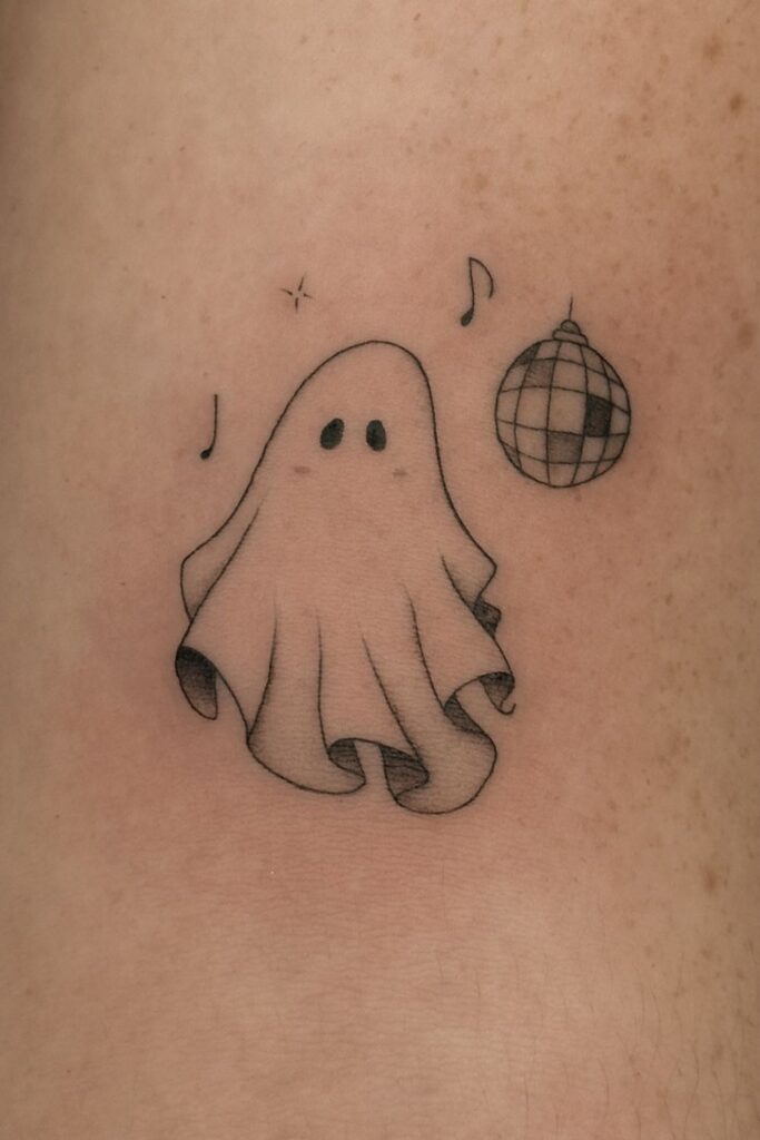 Who says ghosts can t party? This adorable ghost tattoo by jezz.tattoo is ready to dance the night away under a disco ball.