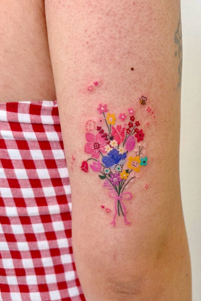 A simple bouquet of flowers tattoo feels clean and elegant, while a cute flower bouquet tattoo is more playful and colorful, often with smaller flowers for a youthful look.