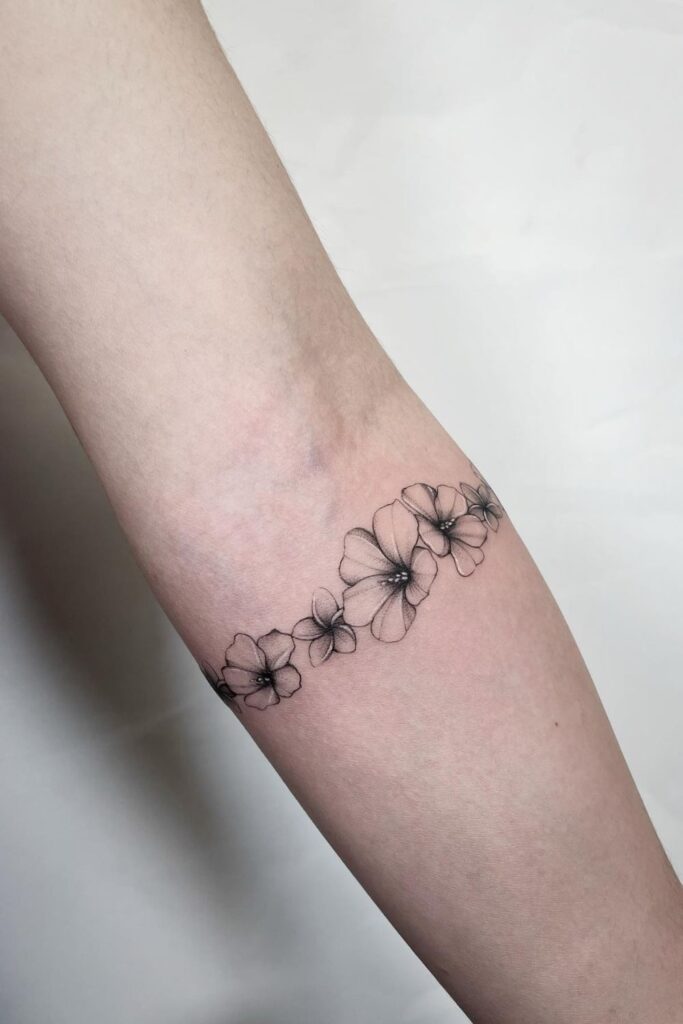 A delicate black-ink flower wrapping around the wrist creates a soft, graceful look.