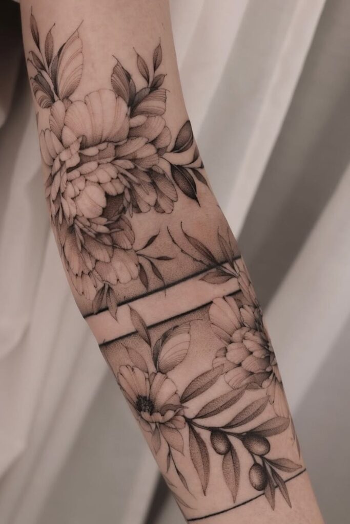 These tattoos often blend multiple flowers, like hibiscus, lilies, peonies, and vines, into one cohesive masterpiece.