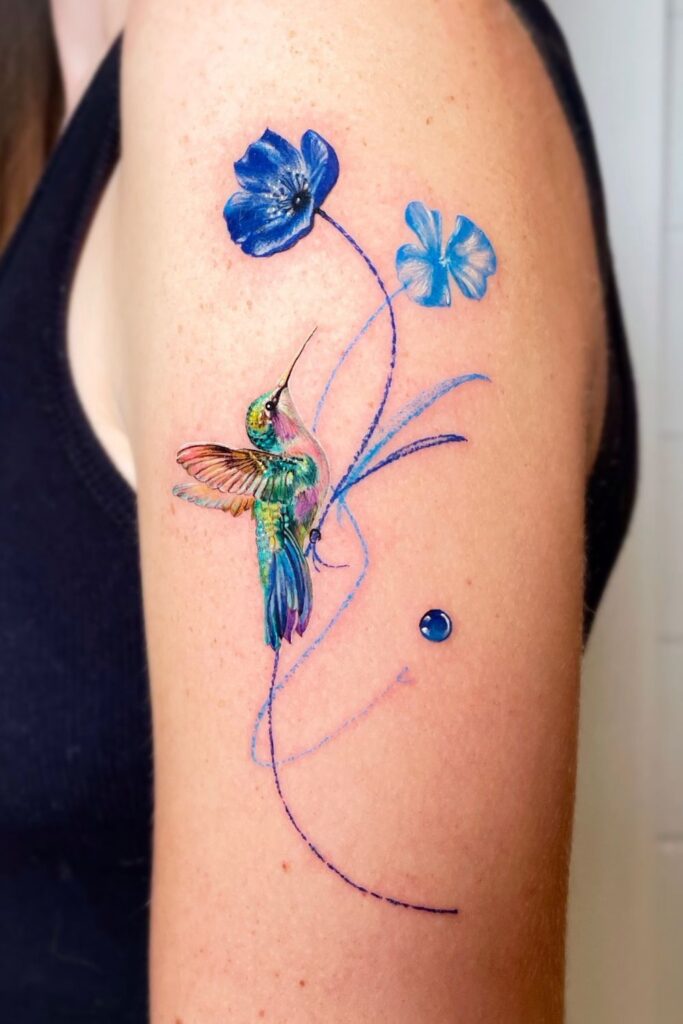 A true work of art, this hummingbird tattoo color design by tattooist_yeye blends watercolor techniques with radiant blue florals and intricate linework.