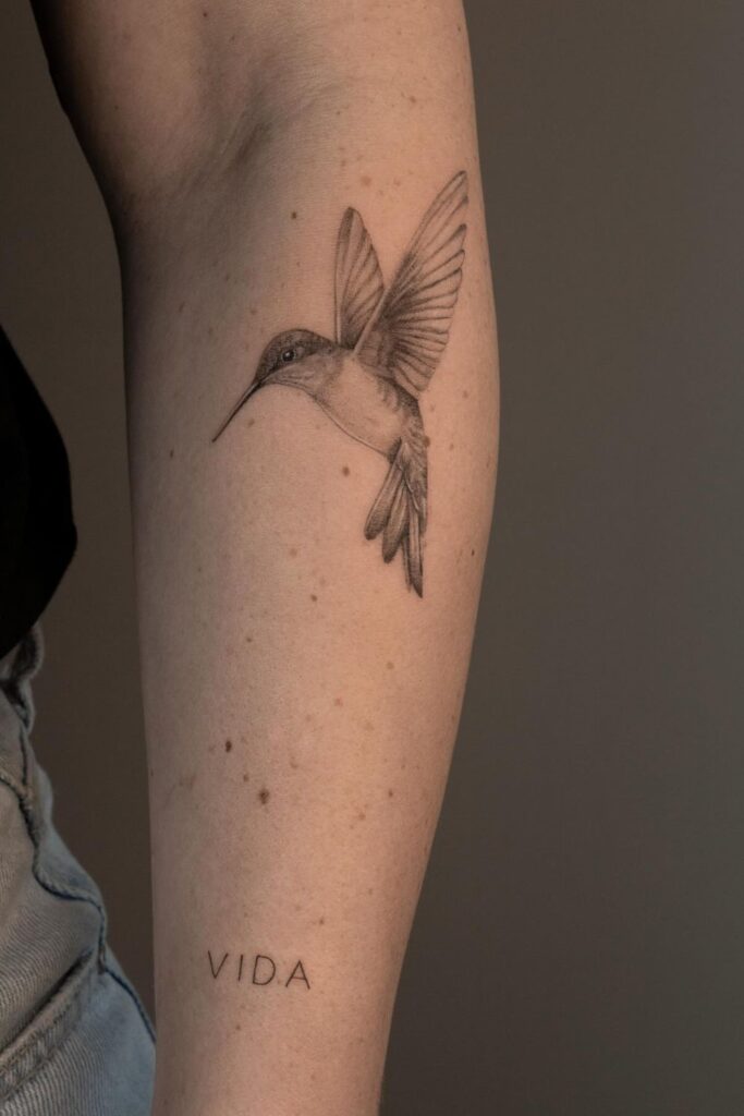 A striking combination of a hummingbird tattoo minimalist design by madebyling.tattoo and the word “VIDA” (Spanish for “life”) placed just below, this tattoo celebrates vitality, movement, and purpose.