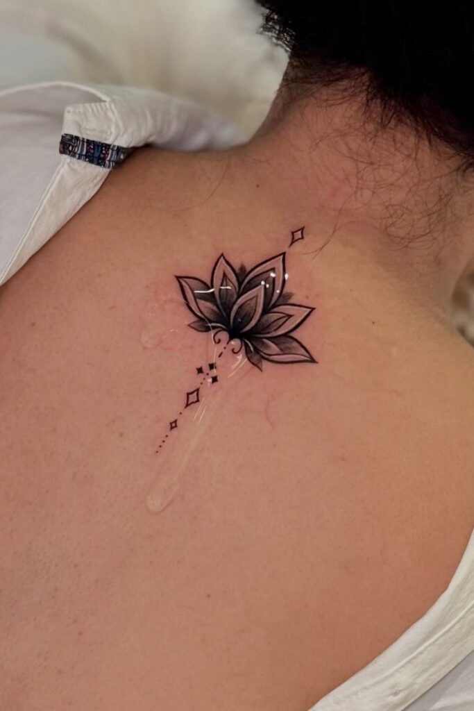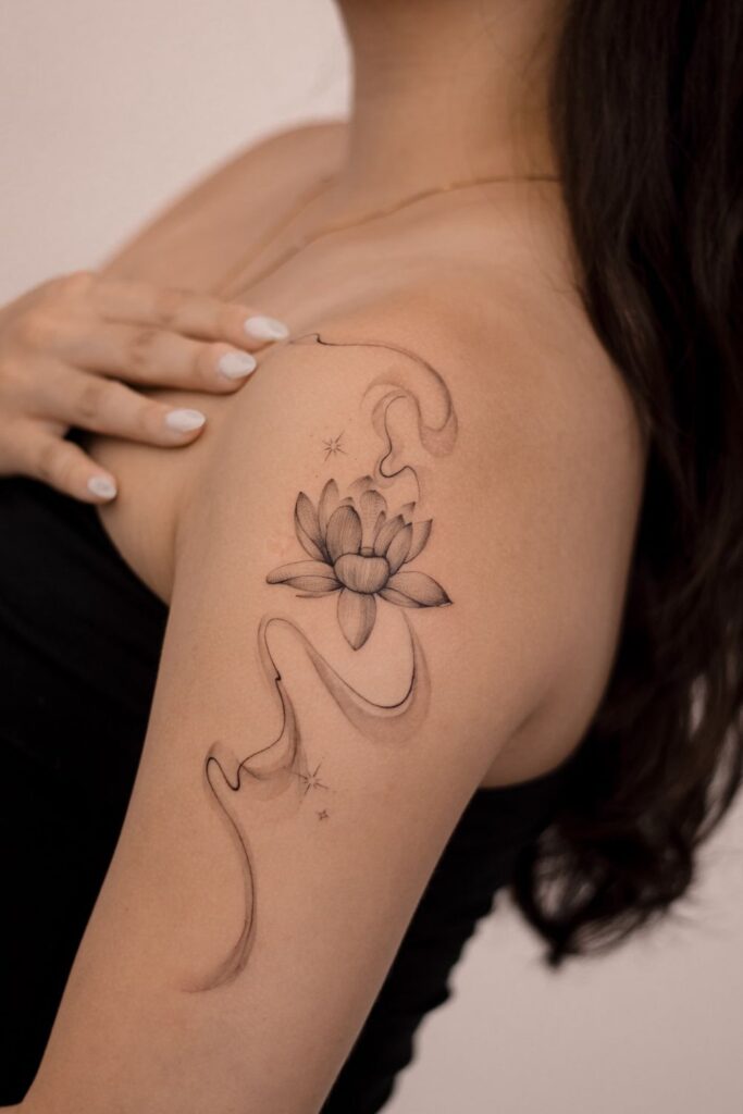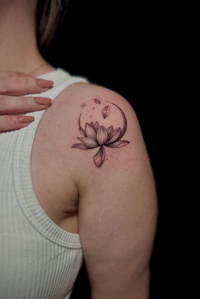 A lotus shoulder tattoo flows gracefully along the shoulder s natural curve, making it a favorite for medium-sized and intricate designs.