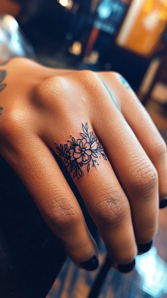 For example, roses often represent passion and deep affection, while lotus flowers symbolize purity and enlightenment. This type of tattoo can be designed with intricate details, wrapping gracefully around the finger to mimic the elegance of a real floral garland.