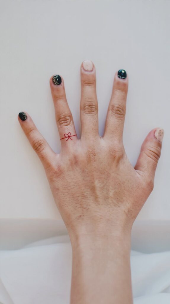 A minimalist bow wedding ring tattoo combines simplicity with a touch of charm and elegance, creating a delicate symbol of love and commitment. This design features a clean, fine-lined bow that wraps lightly around the finger, resembling a wrapped gift or a tender tie between two hearts.