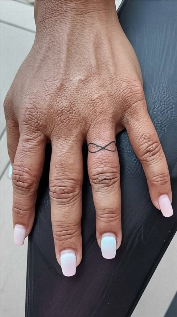 A simple black band tattoo is a minimalistic yet powerful way to symbolize eternal love and commitment. This classic design features a solid, unbroken black line encircling the finger, mimicking the traditional wedding ring but with a unique and permanent twist.