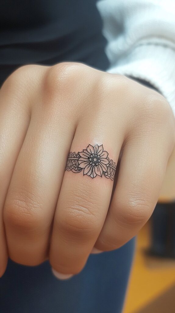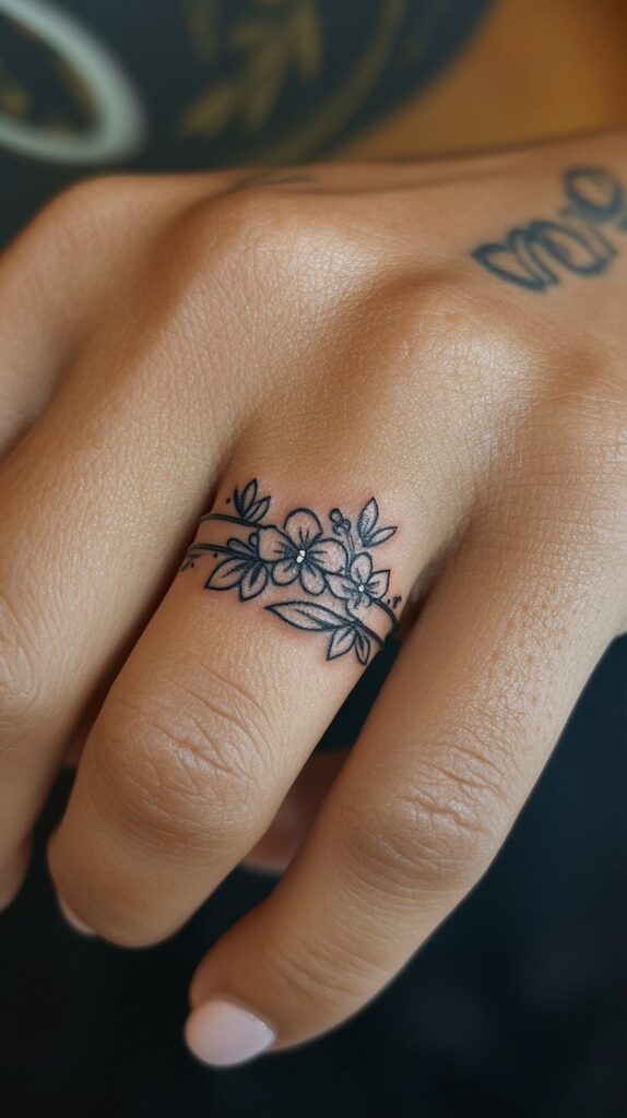 A floral wedding band tattoo is a romantic and delicate choice that beautifully symbolizes love, growth, and natural beauty. Incorporating flowers such as roses, lilies, or lotus blooms into a ring tattoo adds a layer of personal meaning, as each flower carries its unique symbolism.