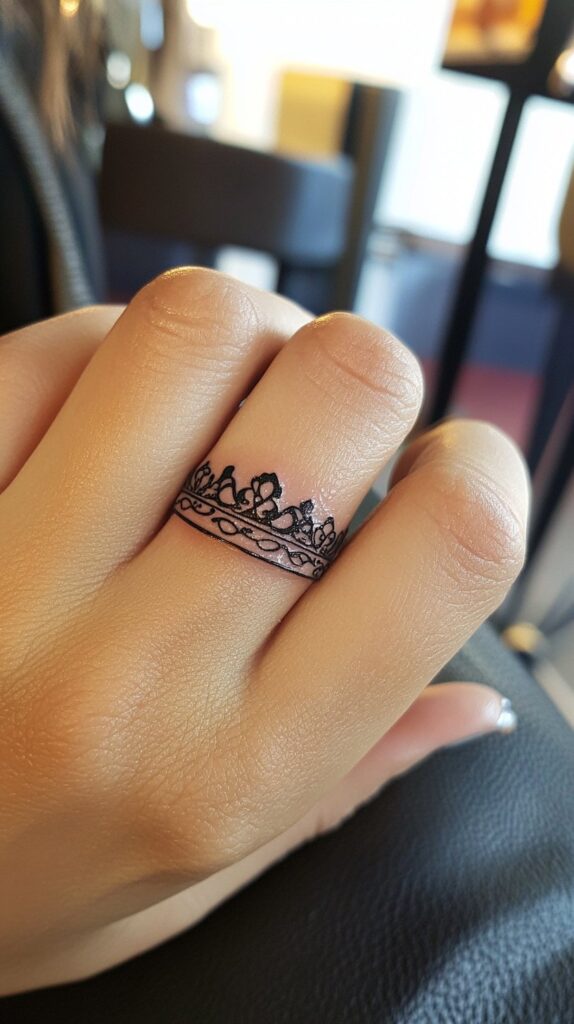 A crown wedding ring tattoo embodies power, loyalty, and commitment, making it a regal symbol for couples celebrating their union. This design often features a delicate crown encircling the finger, signifying honor and mutual respect between partners.
