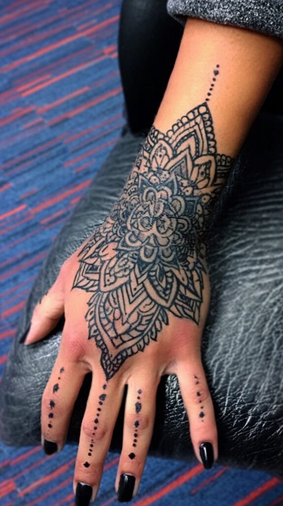 Mandala hand tattoos are a stunning choice for women seeking a tattoo rich in spirituality and intricate artistry. These designs feature symmetrical, circular patterns that radiate from a central point, symbolizing unity, balance, and harmony in life.