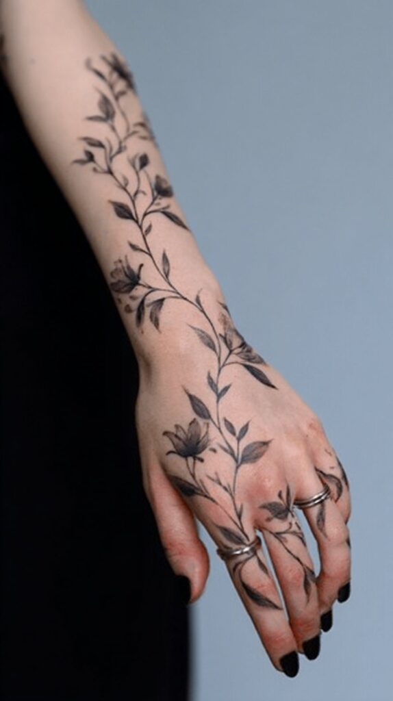 The intertwining tendrils symbolize connection, resilience, and flourishing life, making them a perfect choice for women who want a subtle yet meaningful tattoo. The delicate aesthetic complements the natural contours of the hand, wrapping around fingers or wrists in an elegant embrace.