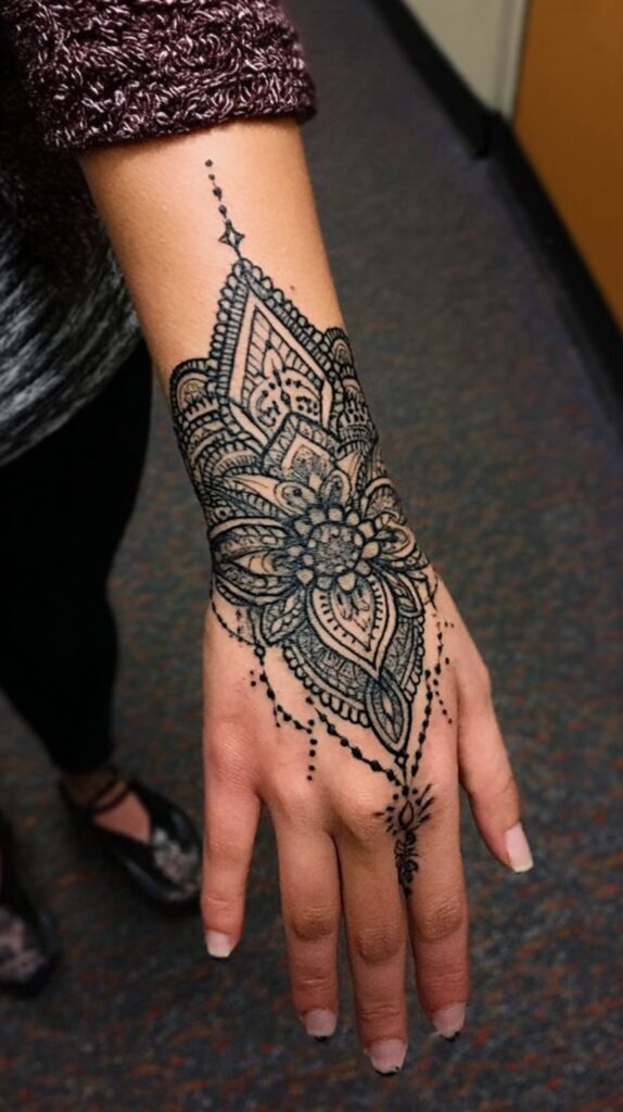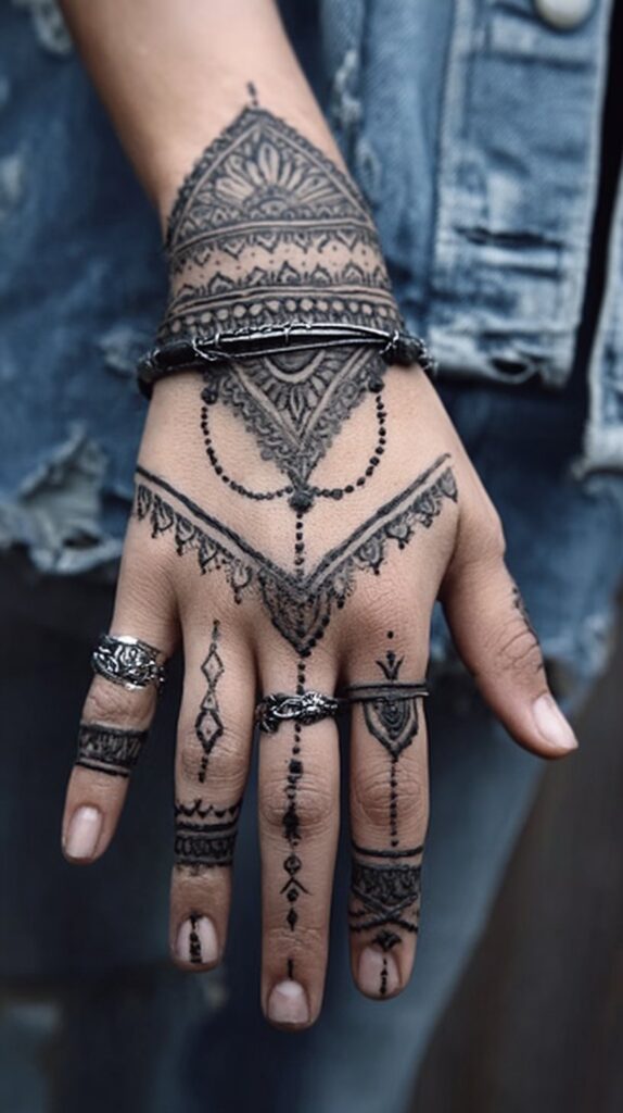 Henna-inspired patterns in women’s hand tattoos draw from the ancient art of mehndi, a tradition rich with cultural symbolism and meaning. Originally used in Indian and Middle Eastern ceremonies, henna designs are characterized by intricate, flowing motifs such as paisleys, flowers, and geometric shapes that adorn the hands with delicate beauty.