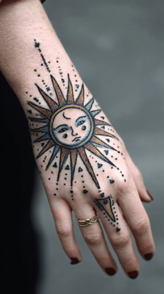 Sun and rays tattoos symbolize vitality, hope, and new beginnings, making them a powerful choice for women seeking meaningful hand tattoos. The sun, as a universal symbol of life and energy, represents warmth, growth, and the light that guides one through dark times.