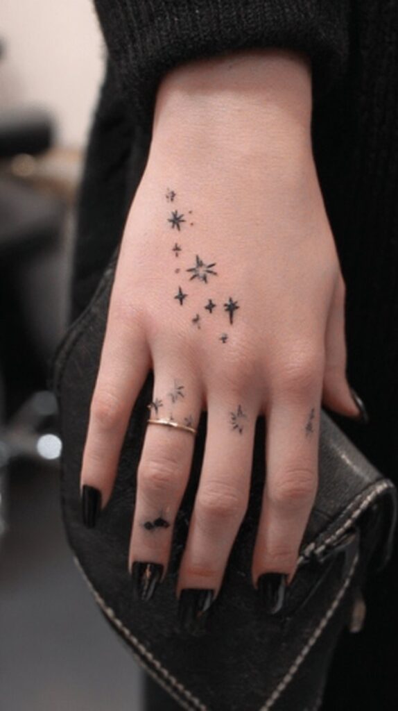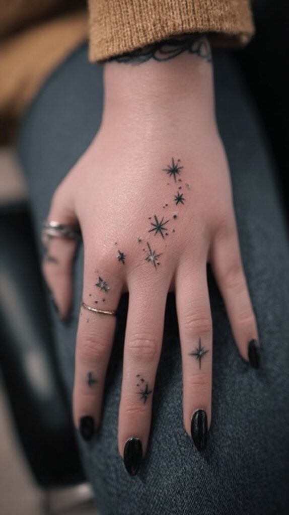 The cluster of tiny stars can also symbolize cherished memories or personal dreams, forming a cosmic tapestry of meaning. On the hand, this design captures the vastness of the night sky in a delicate, intimate display, reminding the wearer of their place in the universe.