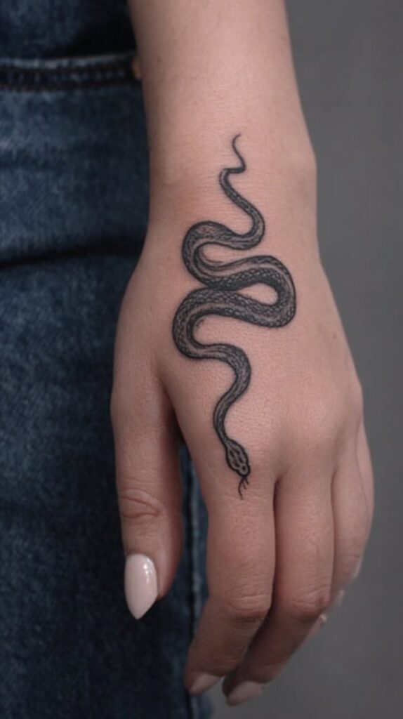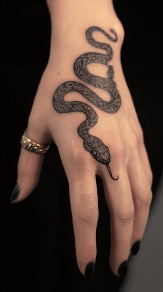 Their sleek, mesmerizing form adds a dynamic aesthetic to hand tattoos, creating a blend of beauty and meaning that reflects both strength and spiritual evolution, making them a compelling choice for meaningful body art.