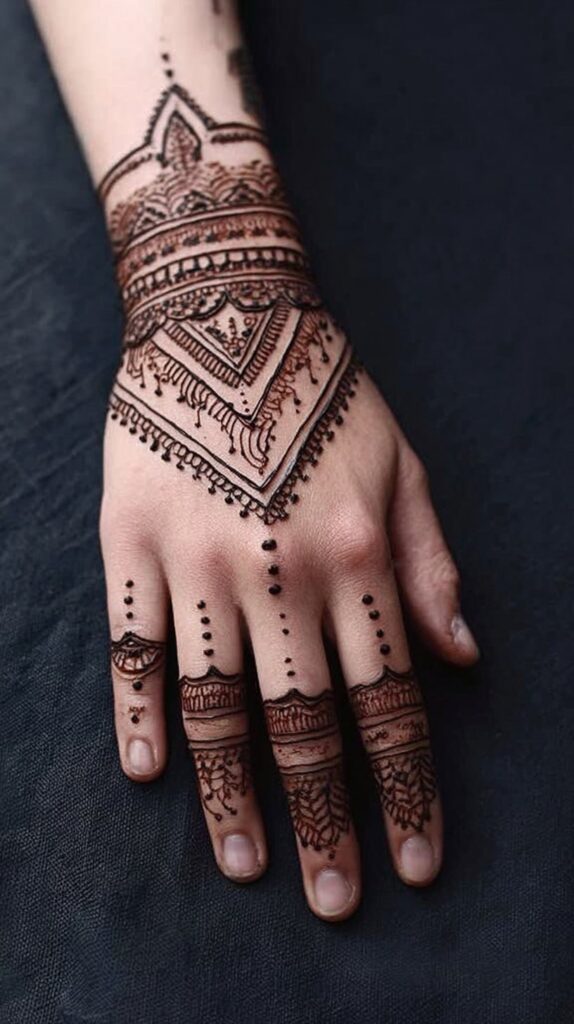 The intricate detail of henna-inspired tattoos highlights the natural curves of the hand, offering a timeless and feminine aesthetic that blends tradition with contemporary tattoo artistry.