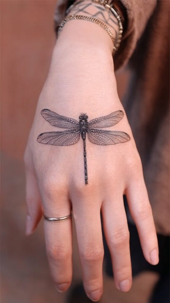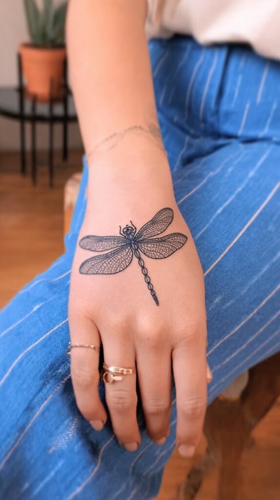 In many cultures, it represents harmony, balance, and a connection to nature. For women, a dragonfly tattoo on the hand becomes a powerful emblem of hope, change, and living authentically, celebrating strength and renewal.